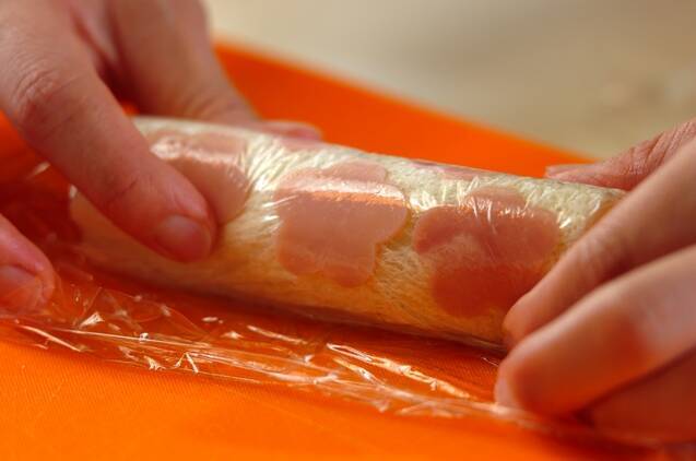 ラップをしいてスライスチーズを並べ、水気をしっかり拭いたサラダ菜をおき、その上に食パンをおく。ケチャップをぬってソーセージをおき、ラップごと巻いて両端をねじって止める(4本作る)。
