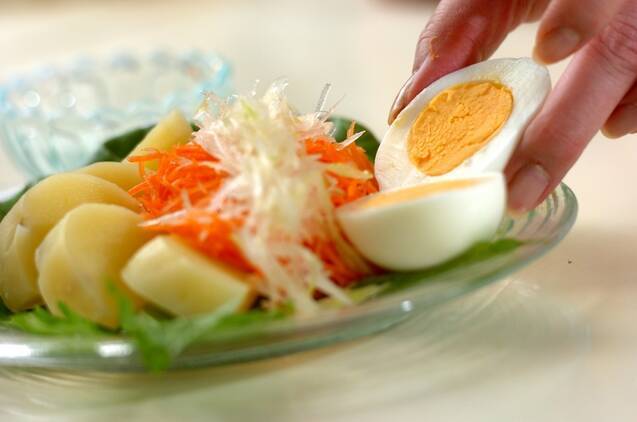 器にサラダ菜を敷き、セロリ、セロリの葉、ニンジン、ジャガイモ、ゆで卵を盛る。