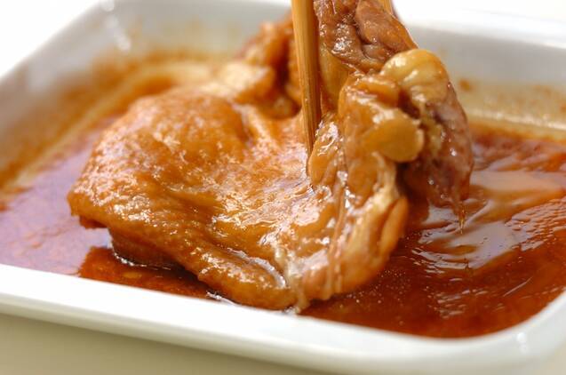 鶏もも肉を取り出し、<タレ>を1分30秒~2分加熱する。<タレ>に鶏もも肉をからめて粗熱が取れるまで冷まし、ひとくち大に切る。