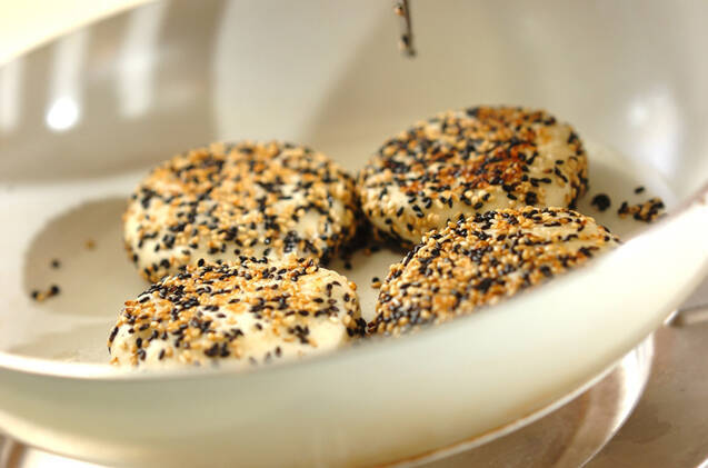 ゴマ油を中火で熱したフライパンに(3)を並べ、両面に焼き色をつける。