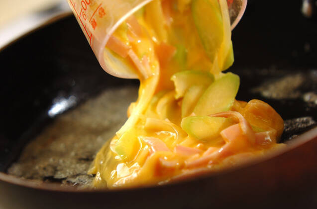 フライパンを中火で熱し、バターを薄くひいて(2)を一度に流し入れる。全体に広げ、混ぜながら火を通していく。全体がかたまってきたらフライパンの端の方で形を整えながらまとめる。冷めたら食べやすい大きさに切ってお弁当箱に詰める。