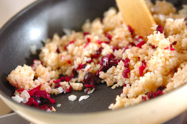 フライパンにサラダ油を入れて強火にかけ、玉ネギがしんなりするまで炒め、玄米ご飯、しば漬けの順に炒め合わせる。細ネギを加えて全体に混ざったら、しょうゆを加えて味をひきしめ、火を止めて白ゴマを混ぜる。