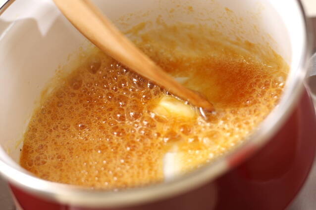 <リンゴのキャラメリゼ>を作る。リンゴは皮をむき、芯を取り、5mm角にカットする。鍋にグラニュー糖を加え、キャラメル色になるまで火にかける。無塩バターを加え、溶けたらリンゴ、バニラビーンズの粒、レモン汁を入れ、リンゴがキャラメル色になったら火を止める。冷ましておく。