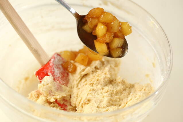 2に粉類を2~3回に分けて加え、泡立て器からゴムベラに変えてサックリ混ぜる。1の<リンゴのキャメラリゼ>100gとクルミを加えて混ぜる。型に入れ、180℃に予熱しておいたオーブンで25~30分焼く。