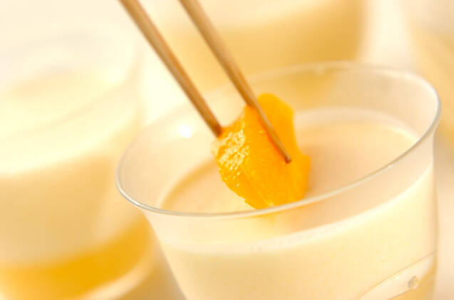 <デコレーション>をする。(3)がかたまったらオレンジの果肉、セルフィーユを飾る。