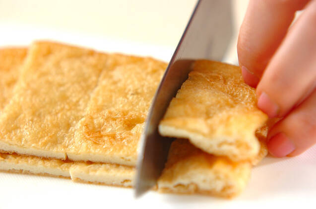油揚げは縦半分に切り、幅3~4cmに切る。