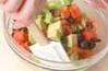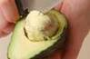 アボカドは種の周りを縦一周切り込みを入れ、両手に挟んでねじるように2つに分ける。包丁の角で種を突き刺して取り、皮を取り、小さめのひとくち大に切る。