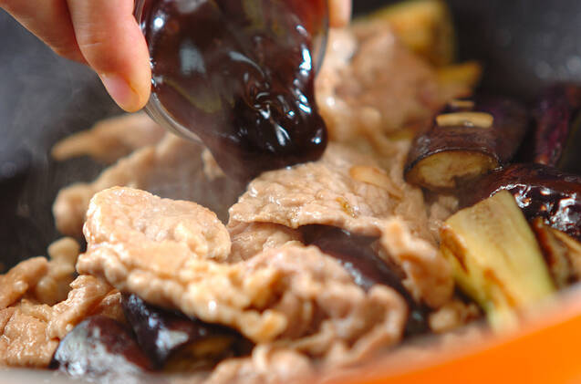 (2)のフライパンにサラダ油小さじ1を熱し、(1)の豚肉、ニンニクを炒める。肉の色が変わったら(2)のナスを戻し入れて合わせ、オイスターソースを加えて炒め合わせる。器に盛り、大葉を散らす。
