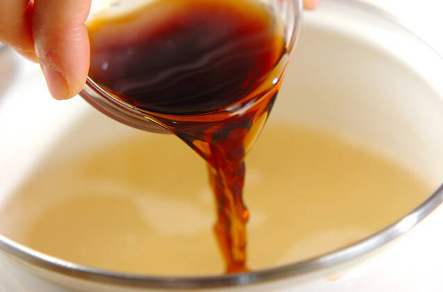 鍋にだし汁を入れて強火にかけ、煮たったら火を少し弱め、<調味料>の材料を加える。