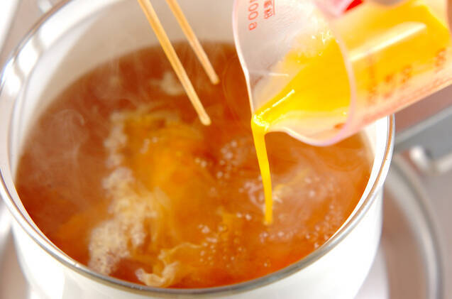 再び煮たったら溶き卵を加え、菜ばしで大きく円を描くように混ぜ合わせる。卵がふんわり浮かんできたら火を止め、ワカメを加える。器に注ぎ、キヌサヤを添える。