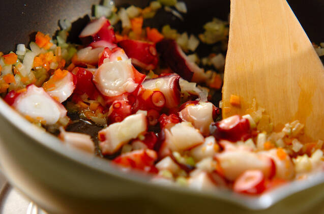 フライパンにオリーブ油、ニンニクを入れて弱めの中火にかける。ニンニクが薄いキツネ色になったら、玉ネギ、セロリをしんなりするまで炒め、ゆでタコ足、ニンジンを加え、炒め合わせる。