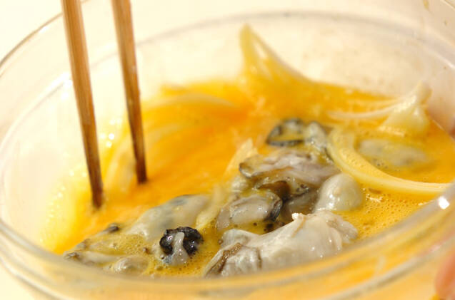 <卵液>に片栗粉をからめた生カキ、玉ネギ、刻みネギを加えて混ぜ合わせる。