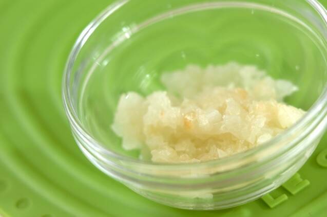 バンズは切れていない場合は、下1/3位の所を横に切る。<ハンバーグ>の玉ネギは細かめのみじん切りにし、フライパンに分量外のサラダ油少々を中火で熱して炒め、冷ましておく。