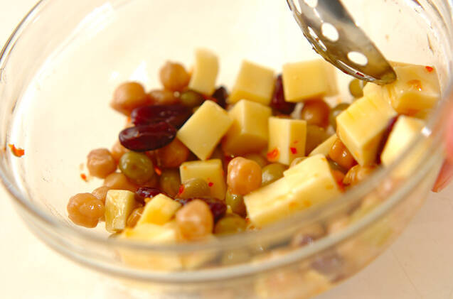ミックスビーンズ、プロセスチーズをボウルに入れ、スイートチリソースで和える。