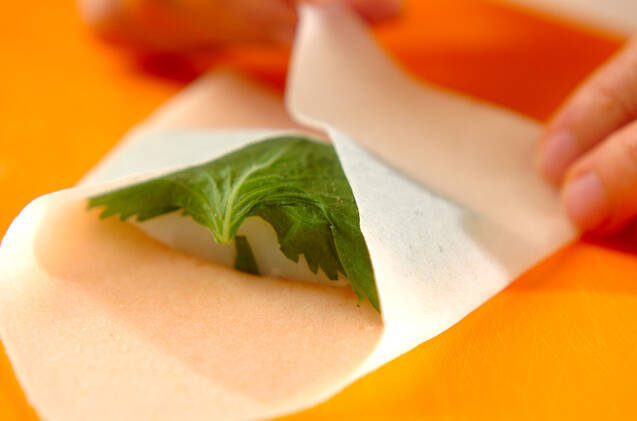 春巻きの皮を広げて(2)をのせ、春巻きの要領で包み、巻き終わりを<水溶き小麦>で留める。