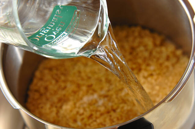 圧力鍋に玄米、酒、塩、水を入れ、蓋をする。