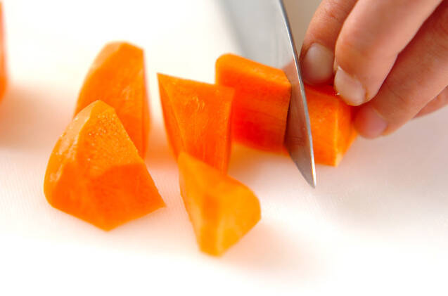 <添え野菜>を作る。ブロッコリー、カリフラワーは小房に分け、ニンジンは皮をむいてひとくち大に切る。水でサッとぬらし、ぬれたまま耐熱容器に重ならないように並べ、ハチミツを全体にかけてバター20~30gを所々にのせ、ラップをして電子レンジで3~4分加熱する。そのまま2分蒸らす。竹串がスッと刺さったらOKです。電子レンジは600Wを使用しています。