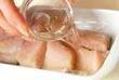サワラの切り身は3~4等分に切り分け、白ワイン、塩コショウを少し多めに振る。15分位置いて、水気を拭き取る。パプリカ、ピーマンはみじん切りにする。