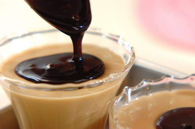 冷やしかためた(3)に(4)の<黒蜜>、<トッピング>のきな粉をかけ、栗、黒豆の甘煮を添える。
