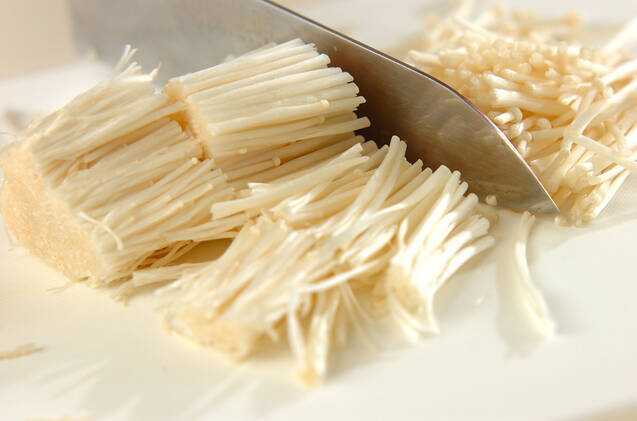 エノキは根元を切り落とし、長さを3等分に切り、根元はほぐしておく。