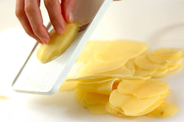 ジャガイモは皮をむき、スライサーで薄切りにする。(ヒント)今回は水に放ちません。
