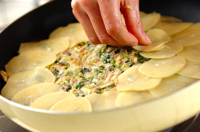 フライパンに分量外のサラダ油を薄くひき、半量のジャガイモを一面に少しずつ重ねながら広げる。ジャガイモの上に(1)の<タネ>を広げながらのせ、残りのジャガイモも一面を覆うように重ねながらのせる。