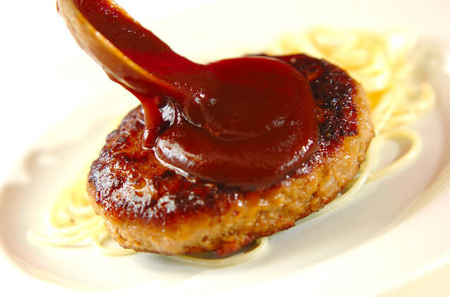 <ソース>の材料を小鍋、またはフライパンに混ぜ合わせ、ひと煮たちさせて火を止める。(ヒント)ハンバーグが焼き上がるタイミングで温められると最高!器に(3)の<パスタ>をのせ、(4)のハンバーグを盛って<ソース>をかける。