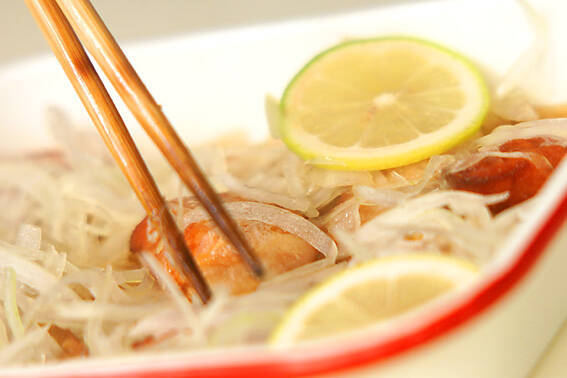 レモンと玉ネギも一緒に漬け込み、ときどき上下を返す。盛り付ける時は少し汁気を切って盛り付ける。