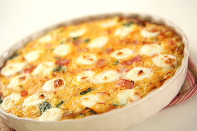 <卵液>に(2)とバジルを加え、混ぜ合わせる。耐熱容器に流し込み、ミニモッツァレラチーズをのせる。200℃に予熱しておいたオーブンに入れ、表面に焼き色が付くまで15~20分焼く。