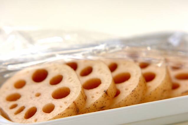 レンコンは、皮ごときれいに水洗いして厚さ1cmの輪切りにして水に放ち、水気をふき取り、ラップをして冷蔵庫に入れておく。