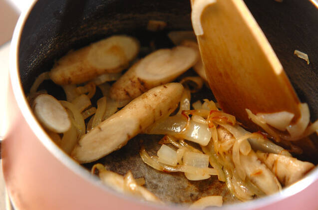 鍋にバターを中火で溶かして玉ネギを加え、しんなりしたらゴボウを加えて炒め合わせる。
