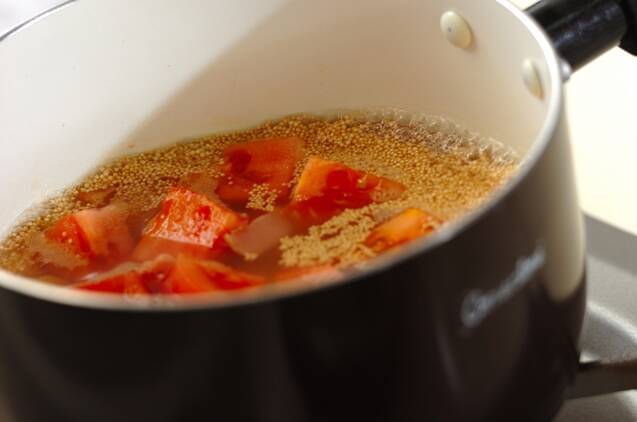 <アマランサスとヒヨコ豆のスープ>を作る。鍋に水を入れて沸かし、アマランサス、トマト、ヒヨコ豆、ベーコンを入れ、混ぜながら弱火で5分くらい煮込む。