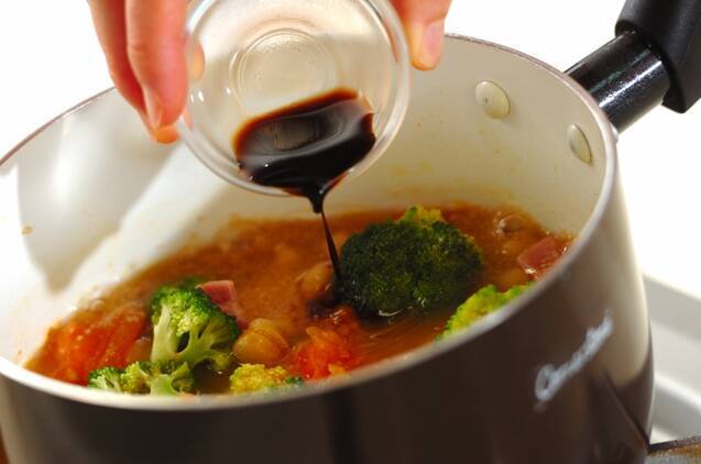 ブロッコリーを加えて混ぜ、顆粒スープの素、バルサミコ酢を加えてひと煮たちさせ、塩コショウで味を調える。ブロッコリーに火が通ったら器に盛る。