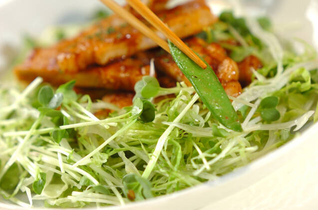 器にセロリと合わせたレタスをしいて(3)を盛り、ソースが残っていたら上からかける。貝割れ菜を散らしてドライパセリを振り、(1)のキヌサヤを盛り合わせ、マヨネーズをかける。