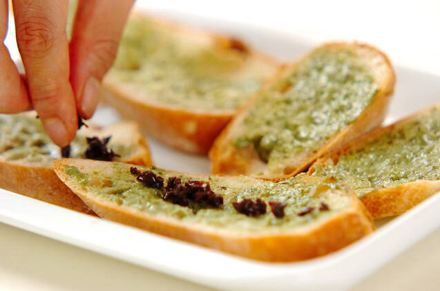 フランスパンに混ぜ合わせたバジルペーストをぬり、ドライトマトを散らす。