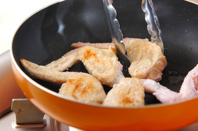 フライパンにサラダ油を中火で熱し、鶏手羽先に薄く焼き色がつくまで焼き、ホーロー、またはステンレスの煮込み鍋に入れる。