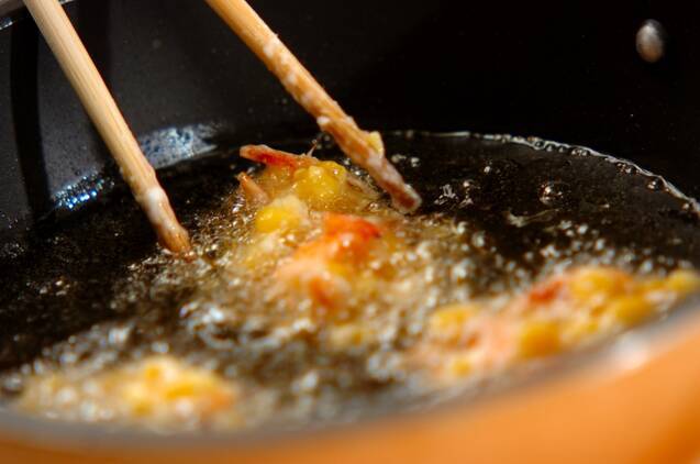 170℃の揚げ油に、(2)をひとくち大くらいずつ落とし入れ、かたまったら返して両面カリッと揚げ、油をきる。器に盛り、塩を添える。