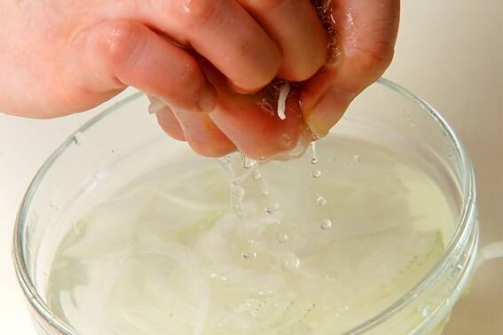 玉ネギは縦薄切りにして水に放ち、水気を絞る。