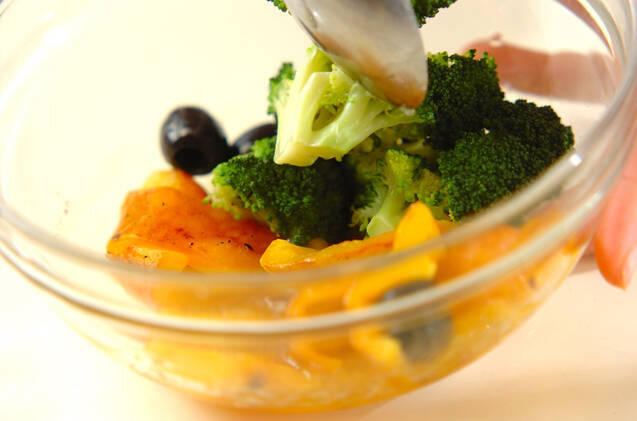 <マリネ液>のボウルに黄パプリカ、オリーブ、ブロッコリーを入れて混ぜる。食べる直前まで冷やしておき、器に盛る。