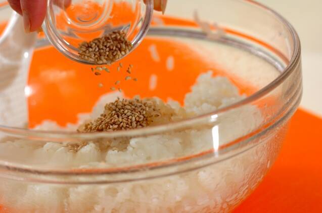 (1)に甘酢ショウガ、白ゴマを加えて混ぜ合わせる。