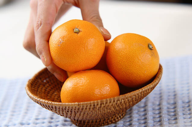 カゴにみかんを盛り合わせる。