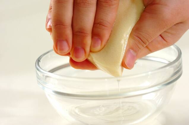高野豆腐は水、またはぬるま湯で柔らかくもどし、軽く水気をきってひとくち大に切る。