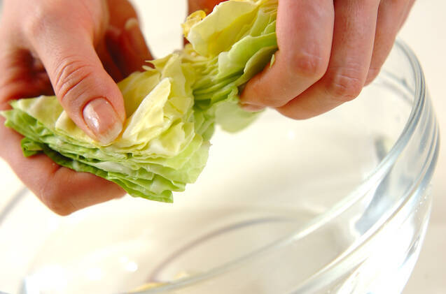 春キャベツは、食べやすい大きさに手でちぎってサッと水洗いし、塩をからめる。プチトマトはヘタを取り、縦4等分に切る。ゆで卵は殻をむいて半分に切る。アンチョビはザックリ刻む。