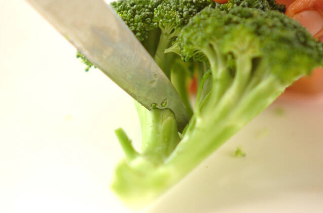 ブロッコリーは小房に分け、熱湯でサッとゆでてザルに上げる。