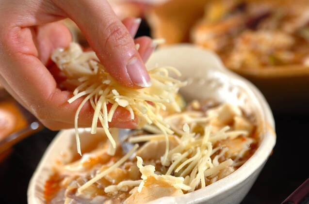 トロミがついたら、残りの白ネギを加え、ゴマ油をまわし入れてひと混ぜし、耐熱容器に盛る。ピザ用チーズをかけ、250℃に予熱しておいたオーブンで7~8分、おいしそうな焼き色がつくまで焼く。