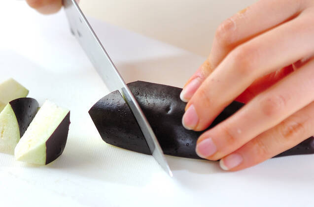 ナスはヘタを切り落として縦4等分に切り、ひとくち大の乱切りにする。分量外の塩水に放ち、ザルに上げて水気を拭き取る。