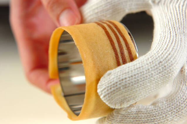 焼き上がったらすぐにセルクル型に巻きつけ、かごの形にし、湿気ないようにするため、湯煎で溶かした洋生チョコレートをかご型の内側にハケでぬってコーティングする。(ヒント)熱い間にセルクル型に巻きつける事になりますので、軍手などをして火傷にはご注意ください。洋生チョコレートとは製菓用のテンパリングがいらないタイプのチョコレートです。