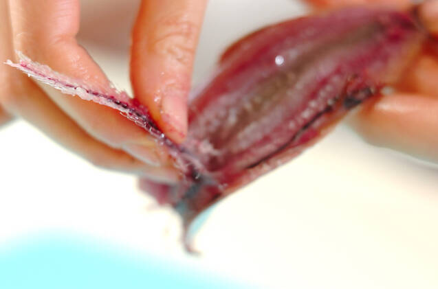 イワシはウロコを取って頭を落とし、腹を斜めに切る。ワタを出し、分量外の塩水で洗う。親指の腹を骨に添わせ、頭側から尾に向かって滑らせるように身をはがし、尾の付け根で骨を折り、身を押さえながら骨を頭に向かってはがすように取る(手開きにする)。腹側に小骨がある場合は削ぎ落とし、両面に塩コショウを振る。イワシの骨は水洗いし、キッチンペーパー等でしっかり水分を拭き取る。