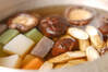 鍋にシイタケ、レンコン、ゴボウ、コンニャクを入れ、だし汁、シイタケの戻し汁、酒、棒ダラの煮汁を加え、ガーゼで包んだかつお節をのせて強火にかける。煮立ったら落とし蓋をして弱めの中火で(煮汁が落とし蓋に当たって全体に煮汁が回っている状態)で、20~25分煮る。
