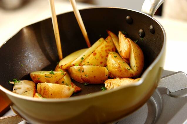 新ジャガイモに竹串が通り、焼き色がついたら、パセリを加えて全体にからめる。器に盛り、岩塩を振る。